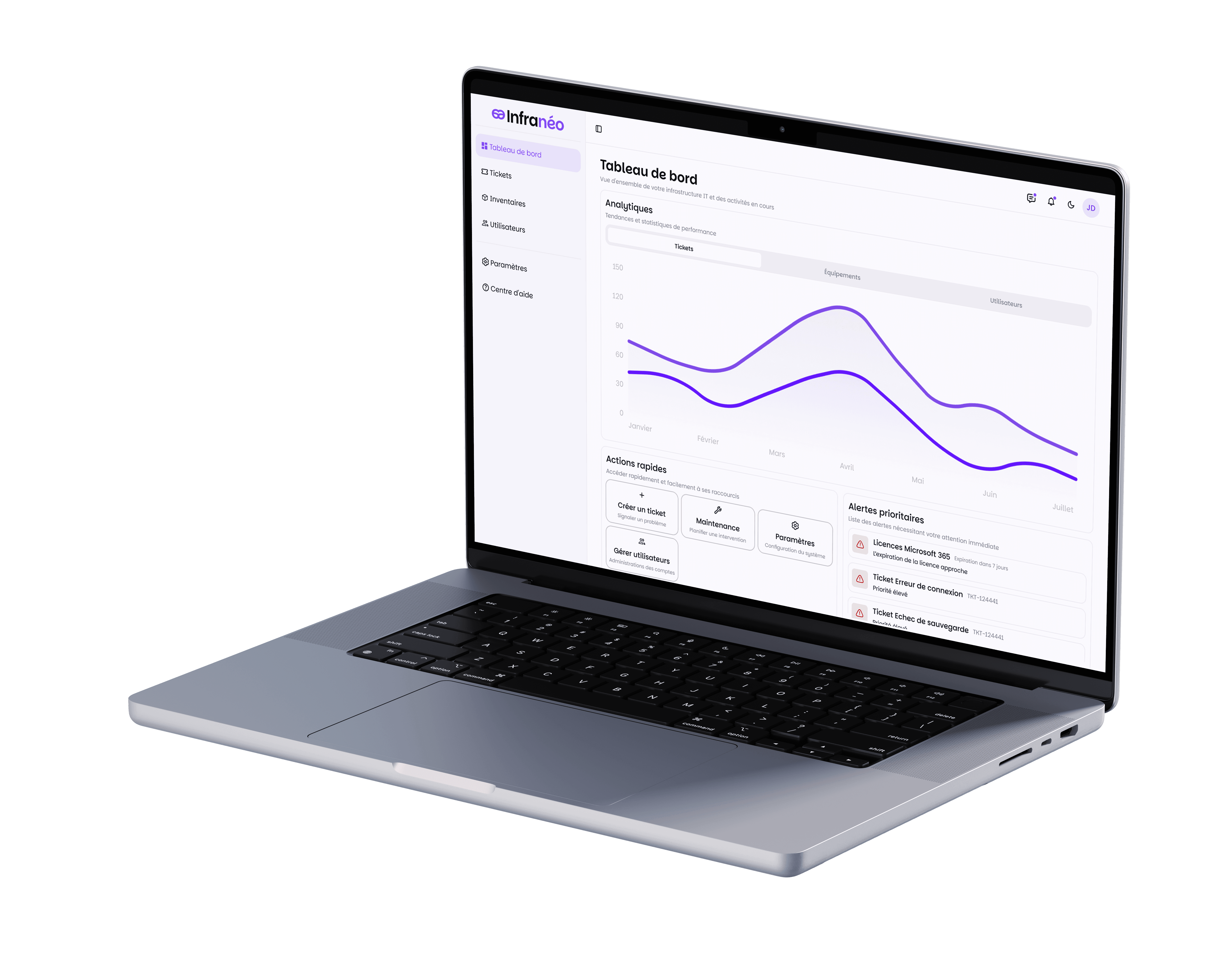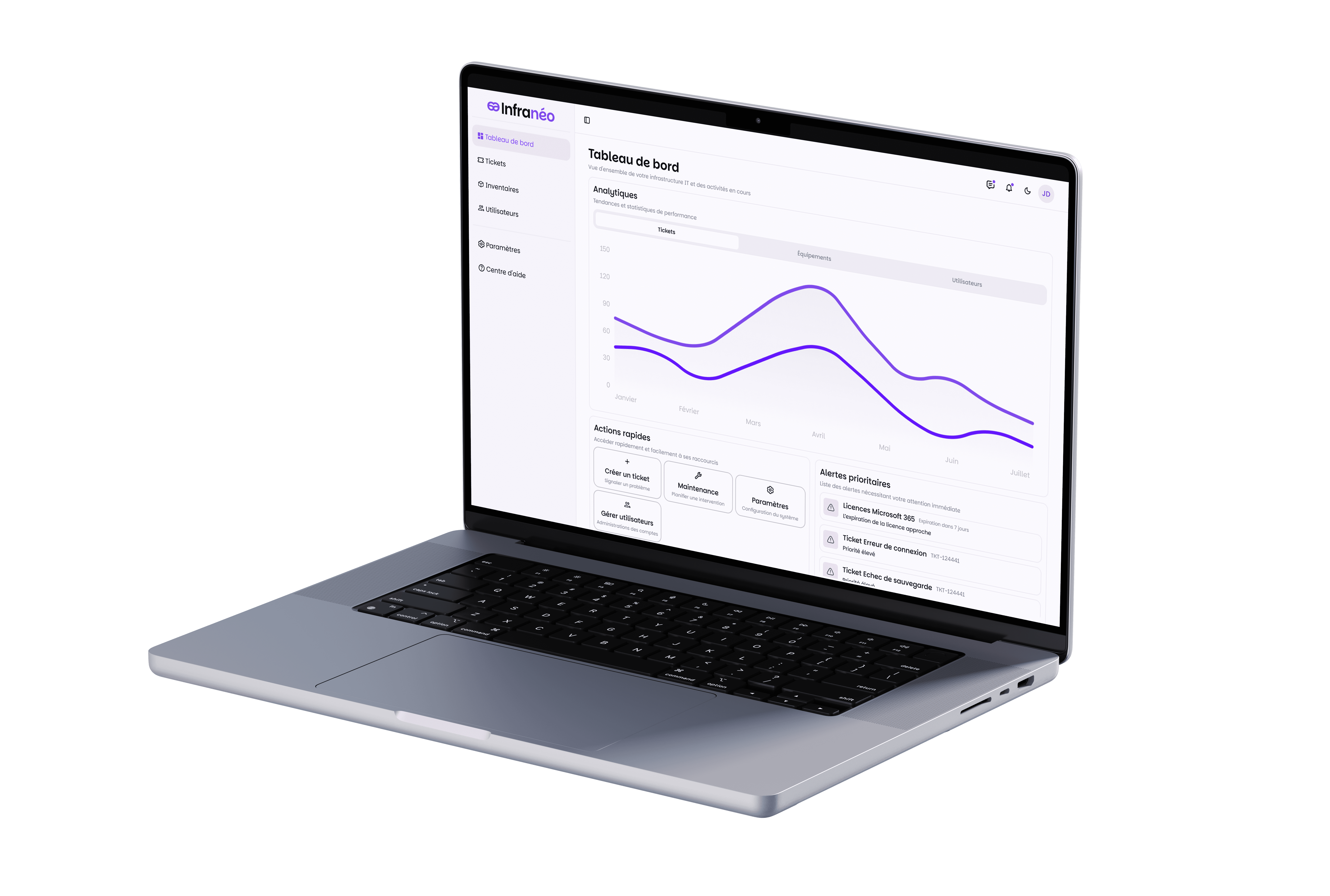 Infranéo est une application web de gestion d’infrastructure IT pensée pour les équipes techniques. En tant qu’UX/UI Designer, j’ai conçu une interface moderne et intuitive centrée sur les besoins des utilisateurs professionnels. L’expérience repose sur une navigation claire via une sidebar structurée (Dashboard, Tickets, Inventaire, etc.), un design system cohérent (mode sombre/clair, hiérarchie typographique, couleurs accessibles, composants) et des fonctionnalités clés un système de tickets avec la possibilité de converser directement dans chaque ticket pour faciliter la résolution. Infranéo allie performance et simplicité pour optimiser la gestion IT au quotidien.